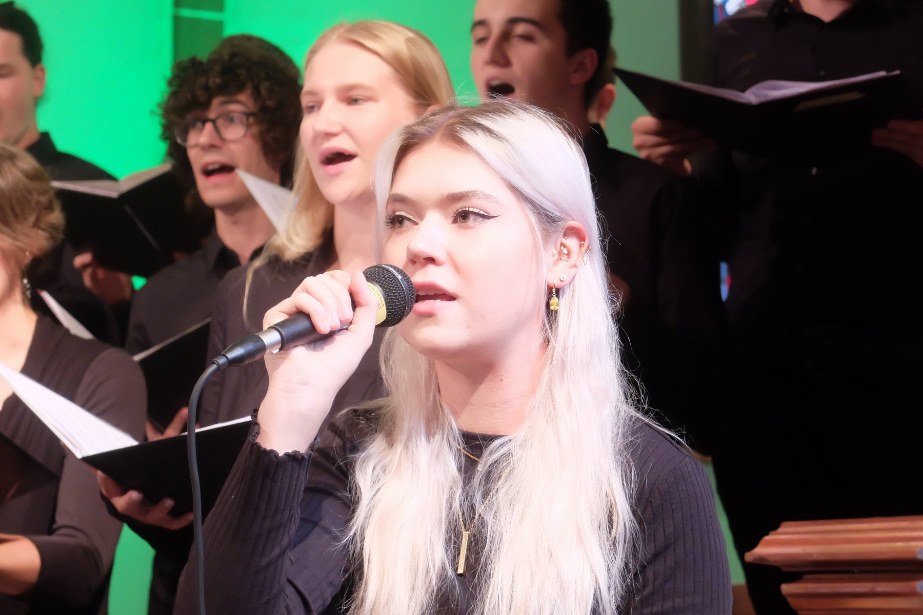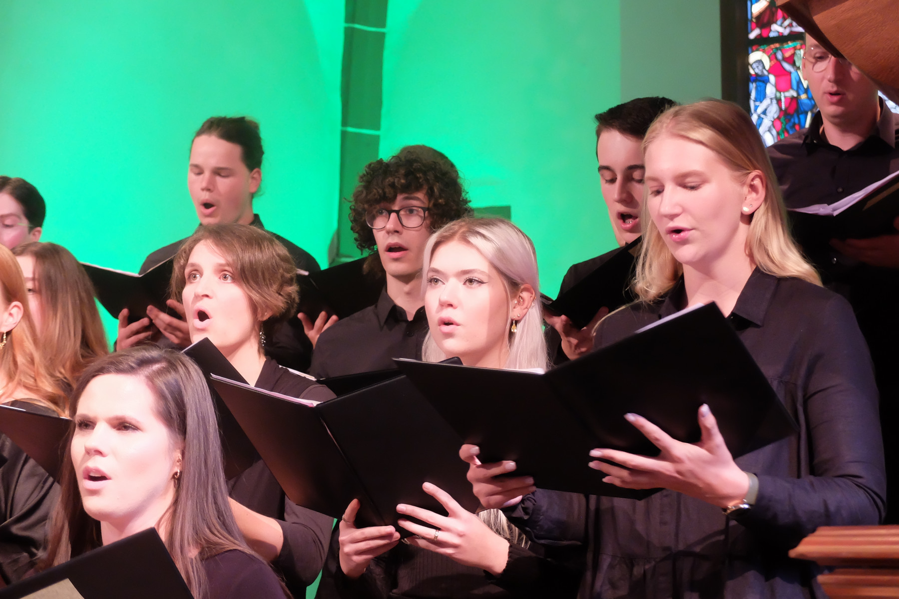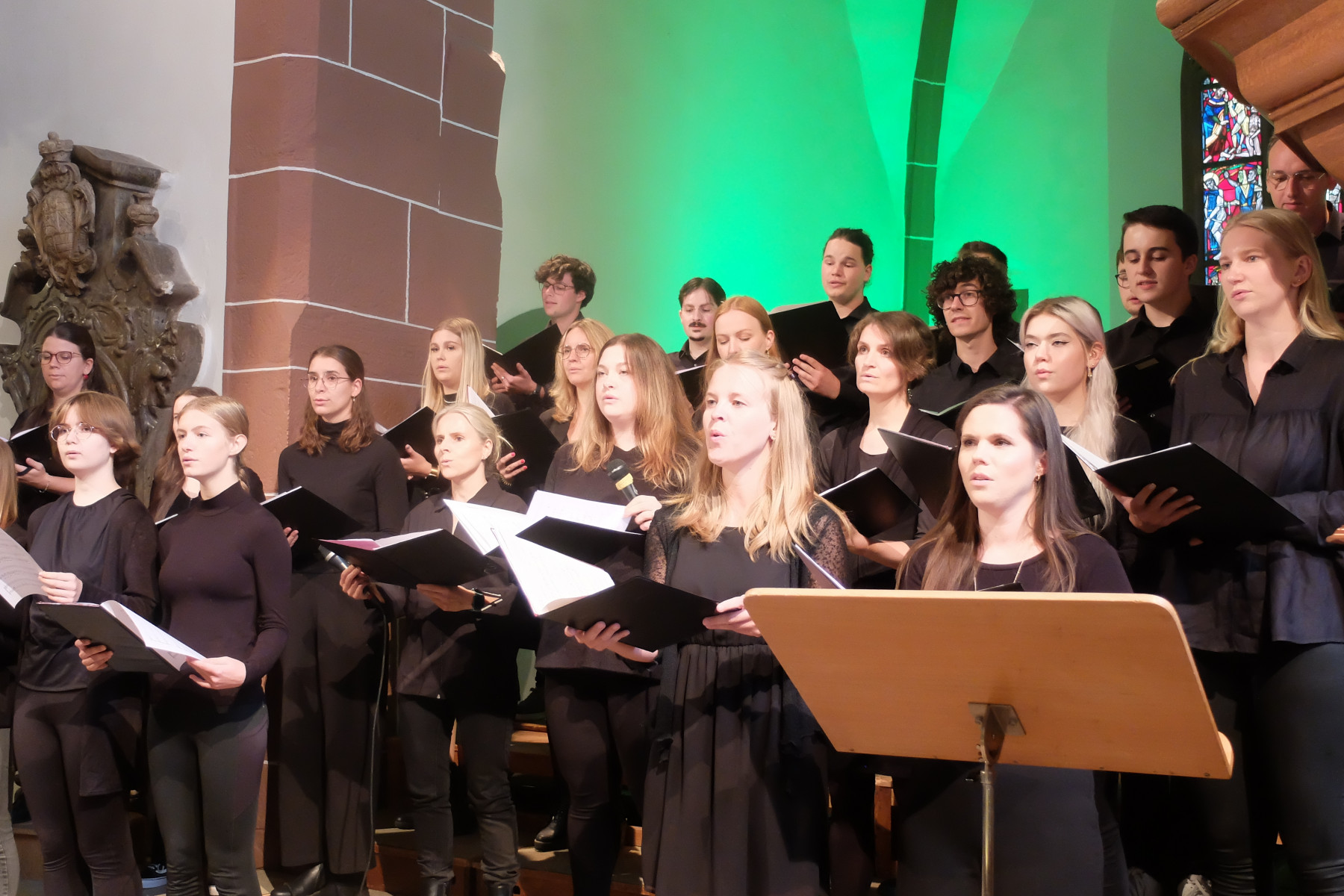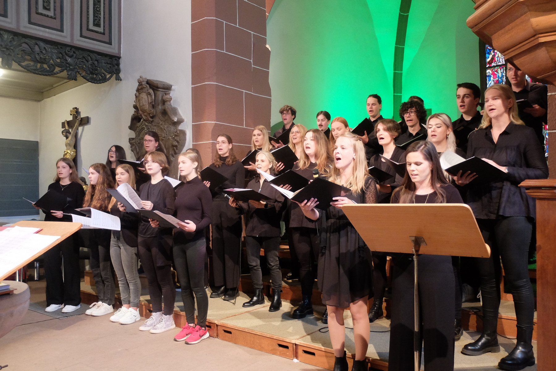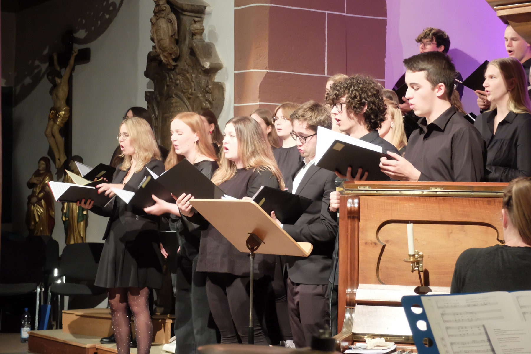 Zwischen Himmel und Erde: Alle Musikstücke verband der Bezug zu diesem Raum. Zu manchen Liedern erläuterten Mitglieder des Jugendchores den jeweiligen Inhalt, Hintergründe oder Rahmen. Begleitet wurden die jungen Sängerinnen und Sänger von einer kleinen Band, bestehend aus Tanja Spatz (Klavier), Martin Fußmann (Bass) und Clemens Frassine (Percussion).
